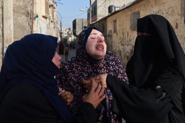 2024年3月3日,在加沙地带南部城市拉法举行的葬礼前,双胞胎孩子纳伊姆和维萨姆的母亲拉尼娅·阿布·安扎(中)哀悼他们的死亡以色列和巴勒斯坦激进组织哈马斯之间的冲突仍在继续。(图片来源:MOHAMMED ABED /法新社)